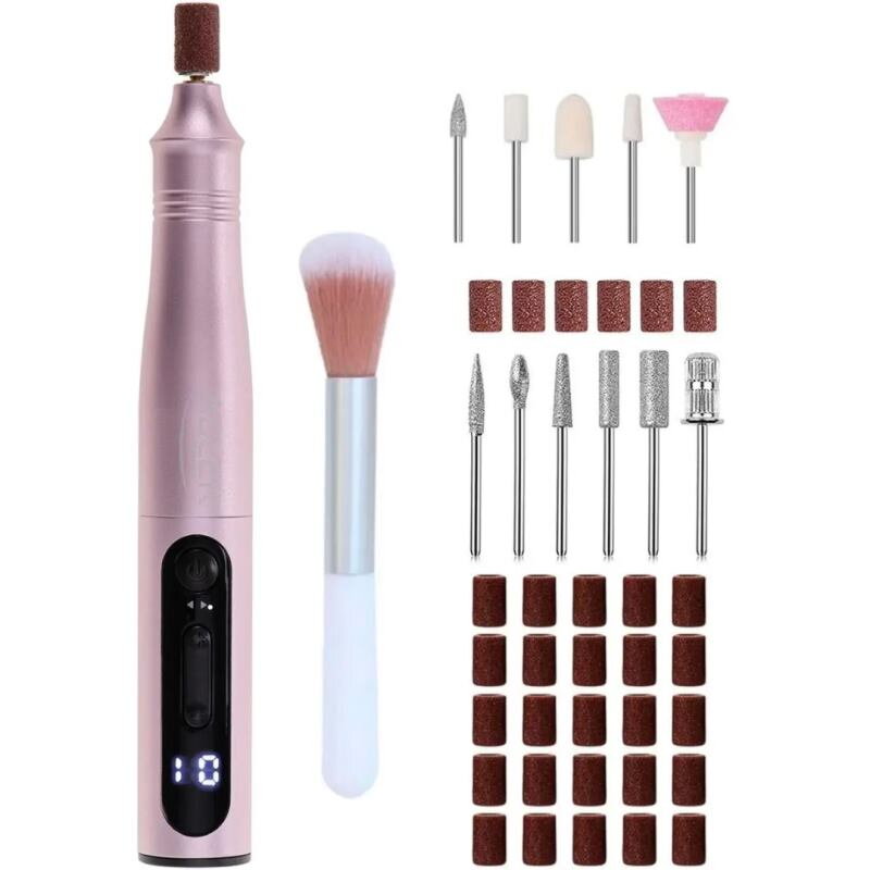 - Bohatá sada príslušenstva: Sada obsahuje 11 tvarovacích nadstavcov, 31 brúsnych pásov pre rôzne stupne starostlivosti o nechty, kefku na čistenie frézok a tašku na uloženie pre pohodlie a poriadok.