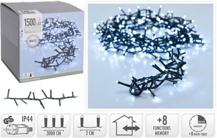 vianočné svetlo, svetelná reťaz, 1500 LED studené biele, zelený kábel, dĺžka svetelnej časti 30 m , priemer žiatovky 5 mm, dĺžka prívodného káblu 3 m, vzdialenosť medzi žiarovkami 2 cm, s časovačom 8 hodín zapnuté, 16 hodín vypnuté, s 8 funkciami a pamäťou, vhodné na 330 cm vianočný stromček, IP44- na vonkajšie/vnútorné použitie