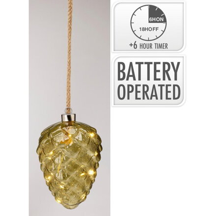 závesná ozdoba šiška, 10 LED, 12x12x16 cm, sklo, zelená, s časovačom 6 hodín zapnuté, 18 hodín vypnuté, 2xAA batérie ( nie sú súčasťou)