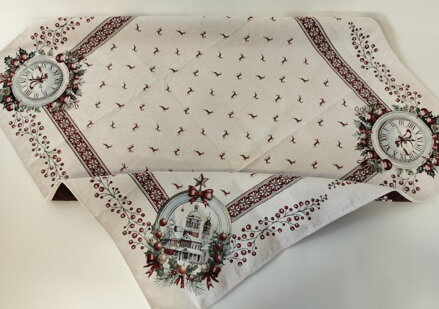 Obrus gobelínový, vianočný dekor. Gramáž: 435 g/m2. Zloženie: 45% Bavlna 35% Polyester 20% Akryl. Návod na údržbu: Možno prať v práčke maximálne pri teplote 30°C. Výrobok sa nesmie bieliť. Nesmie sa sušiť v bubnovej práčke. Žehliť pri maximálnej teplote žehliacej plochy 110°C bez pary. Výrobok sa nesmie chemicky čistiť.