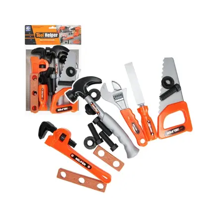 Náradie oranžové sada, obsah sady je kľúč, kľúč, kladivo, pílový kotúč, 2x doska, 4x skrutky + krytky skrutiek. Cena je za 1 sadu. Má rozmer 20x30x5 cm. Vhodné pre deti vo veku 3+.