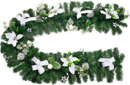 Vytvorte vo svojom domove sviatočnú atmosféru s elegantnou girlandou MagicHome Vianoce. Táto bohatá zelená girlanda je zdobená bielymi kvetmi, ozdobnými guľami, hviezdami a detailmi, ktoré podčiarkujú zimný nádych dekorácie.