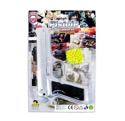 Pištoľ na guľôčky je 21 cm veľká, v balení s balíčkom nábojov.